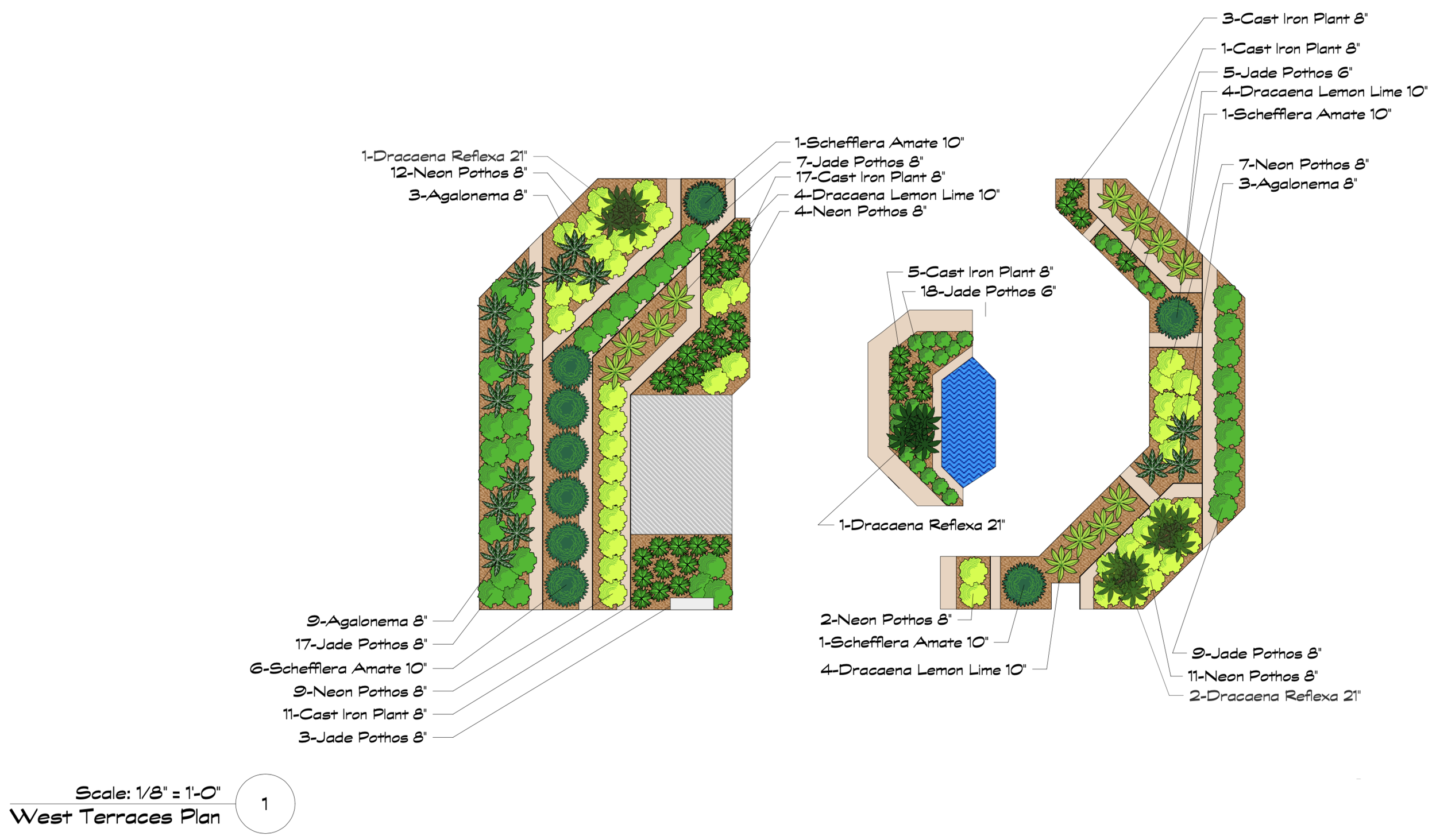 I was tasked with working as the lead designer in creating and bidding an interiorscape design for The Galleria Mall. My responsibilities included clarifying design objectives and gathering budget information from the client. The project included all the planters throughout the mall with the main design element being the planting beds around the western elevator atrium in the seating area above.